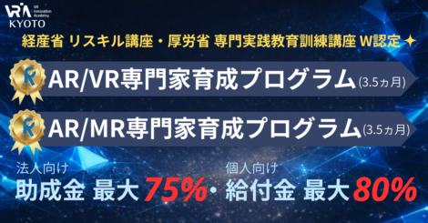 2026年2月19日 ニュース, イベント経産省リスキル講座認定・厚労省専門実践教育訓練講座指定が2講座に!「AR/VR専門家育成プログラム」「AR/MR専門家育成プログラム」~4月生向け入学説明会、オンライン無料個別相談会 実施中~ 経産省リスキル講座認… 続きを読む 2025年10月17日 ニュース, イベント2026年4月開講の入学説明会申込受付中!AR/MR専門家育成プログラムが経産省リスキル講座に認定されました! 2026年4月開講日… 続きを読む 2025年10月17日 ニュース, イベント11/21 京(みやこ)ITフェア2025(京都経済センター)にブース出展し、入学説明や個別相談を行います(入場無料) 1/23(木)に、Q… 続きを読む 2025年9月1日 ニュースeラーニング講座の価格改定のご案内 寒暖定まらぬこのごろ… 続きを読む 2025年4月25日 ニュース, イベント2025年10月開講日程決定!入学説明会・オープンキャンパス・AR/VR体験会申込受付中! 2025年10月開講… 続きを読む 2025年3月19日 ニュースeラーニング新講座追加および価格改定、通学・リモート講座4月開講の助成金・給付金申請〆切間近の講座のご案内 寒暖定まらぬこのごろ… 続きを読む 2025年1月10日 ニュース, イベント1/23 Kansai XR EXPO(大阪・京橋)にブース出展し、入学説明や個別相談を行います(入場無料・事前申込制) 1/23(木)に、Q… 続きを読む 2024年12月3日 ニュース助成金が活用できるお得なeラーニング講座をVRイノベーションアカデミー京都が新設! 助成金が活用できるお… 続きを読む 2024年11月12日 ニュース, イベント2025年4月開講日程決定!入学説明会・オープンキャンパス・AR/VR体験会申込受付開始します! 2025年4月開講日… 続きを読む 2024年7月31日 ニュース「AR/VR専門家育成プログラム」のPBL(開発実務演習)のテーマ「AR開発」新設記念 特待生キャンペーン(受講料一部をキャッシュバック)を実施 「AR/VR専門家育… 続きを読む 投稿ナビゲーション 1 2 3 次へ 10/26