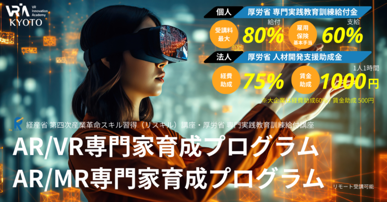 株式会社クロスリアリティ(本社:京都市下京区、代表取締役社長:齋藤公男)が運営する、VRイノベーションアカデミー京都(以下「VRIA京都」または「当校」)が提供する、「AR/VR専門家育成プログラム」「AR/MR専門家育成プログラム」(以下「本講座」)は、2講座ともに経済産業省 「リスキル講座(第四次産業革命スキル習得講座)」認定、厚生労働省「専門実践教育訓練講座」指定となりました。(「AR/VR~」は再認定)これにより、個人受講者は専門実践教育訓練給付制度を活用することで、受講料の最大80%の給付を受けることが可能です。また、法人受講者においては、人材開発支援助成金を活用することで、受講料の75%(大企業は60%)の助成に加え、賃金助成も得ながら、社員のリスキルやDX人材育成が可能となります。